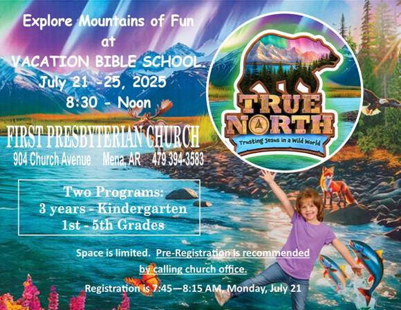 VACATION BIBLE SCHOOL: “TRUE NORTH”: On Sunday, June 20, we will be decorating the church for VBS. We need MANY hands to get it done! Please consider staying after lunch to assist. Also, don’t forget to invite all the kids you know! Application forms are at the church, or you can cut and paste the advertisement below to social media.